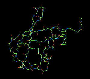 Stick Models are an ideal way to analyze macromolecular structures. The models give an excellent representation of bonds, local, and global interactions. VistaPDB supports Side Chain and Main Chain rendering, measurements between atoms, and residue selections. Coloring of individual atoms is standard, the default colors: